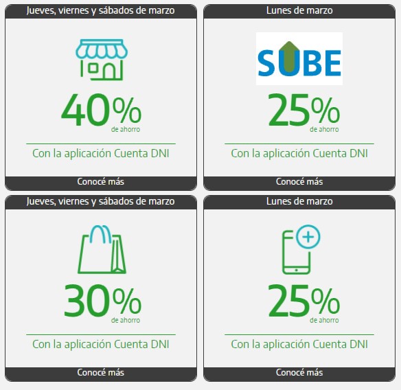 Recarga de tarjetas de transporte: esta promo es similar a la de celulares. Las personas que recarguen su Tarjeta SUBE los lunes mediante la funcionalidad “Recargas” de Cuenta DNI tendrán 25% de descuento, también con un tope 100 pesos por persona y día.