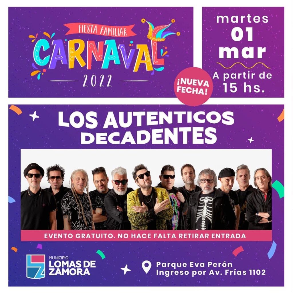 Los festejos por los Carnavales 2022 en Lomas de Zamora se realizarán en el Parque Municipal Eva Perón, a partir de las 15:00 horas los dos días- Todas las actividades son con acceso libre y gratuito, no se retiran entradas. El ingreso del público se realiza por la entrada de Av. Frías al 1500.