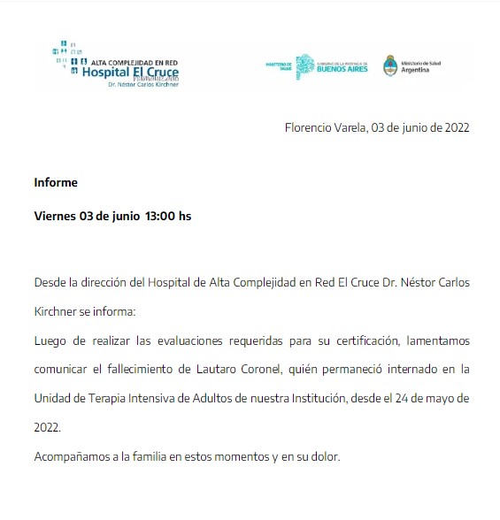 «Luego de realizar las evaluaciones requeridas para su certificación, lamentamos comunicar el fallecimiento de Lautaro Coronel, quién permaneció internado en la Unidad de Terapia Intensiva de Adultos de nuestra Institución, desde el 24 de mayo de 2022», destacaron en el parte emitido este viernes.