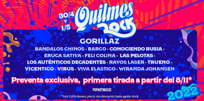 La vuelta del festival Quilmes Rock que en abril-mayo de 2022 concretará una nueva edición con la banda electrónica británica Gorillaz como plato principal, desde este lunes 8 de noviembre se puden comprar los primeros 5.000 abonos.