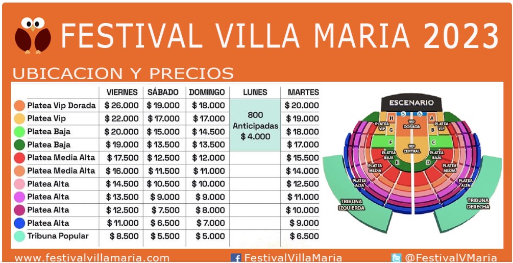 El precio de las entradas para el Festival de Villa María dependen de la ubicación y día. La más barata es la Tribuna popular del domingo 12 de febrero que tiene un costo de $5.000. Mientras que la más cara es la Platea Vip Dorada del viernes 11 que tiene un costo de $26.000.