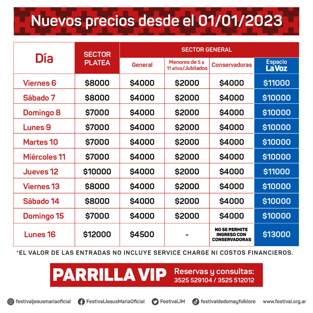Comprar las entradas de Jesus María 2023 tiene un costo mínimo de $4.000 y un máximo de $13.000. El precio para ingresar una conservadora es de $4.000. A continuación los precios por día para comprar los tickets.