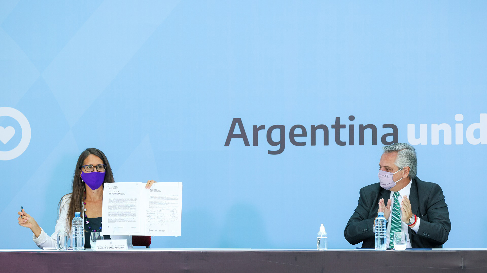 El mandatario estuvo acompañado por la ministra de las Mujeres, Géneros y Diversidad, Elizabeth Gómez Alcorta, y el ministro del Interior, Eduardo de Pedro, quienes suscribieron el acuerdo por el Poder Ejecutivo Nacional.