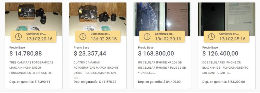 Mientras que un lote de dos celulares iPhone tiene una base de $ 168.800,00 y las cámaras Nikon, por ejemplo parten desde los 14.700 pesos.