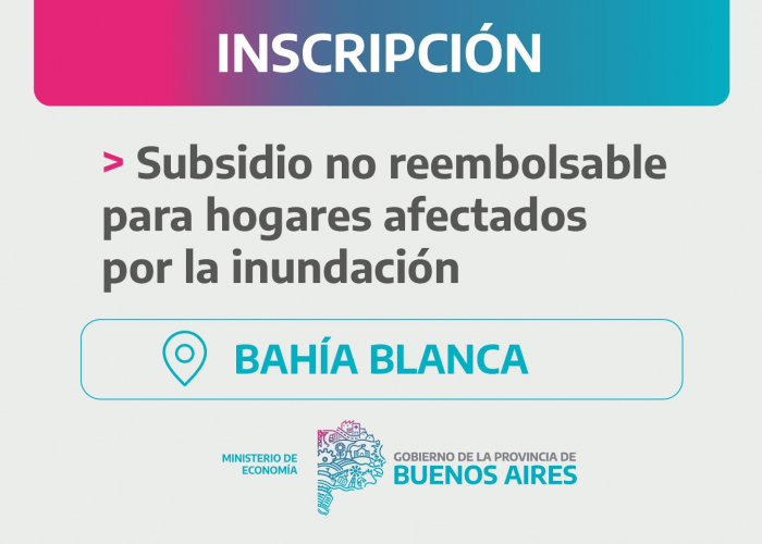 Se encuentra abierta la inscripción para el subsidio destinado por el Gobierno de la Provincia de Buenos Aires a hogares afectados por la inundación en el partido de Bahía Blanca. Las y los afectados podrán acceder a $800 mil pesos por vivienda para que sean utilizados en arreglos del hogar, compra de muebles o electrodomésticos, como también para atender otras necesidades, y no será necesario hacer ninguna rendición al respecto.