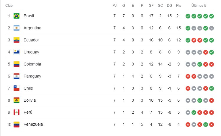 La Argentina marcha segunda con 15 unidades, segunda ante los 21 puntos de Brasil. Tercero se ubica Ecuador con 12 puntos. Mientras que Uruguay y Colombia tienen 9 puntos.
