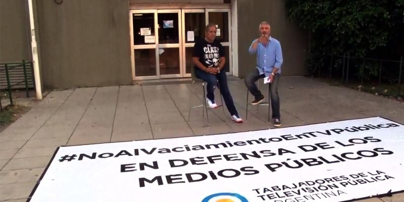 Trabajadores de la TV Pública emitieron el noticiero desde la puerta del canal público como una forma de protesta a la decisión del gobierno de Mauricio Macri de eliminar las emisiones correspondiente a los fines de semana.
