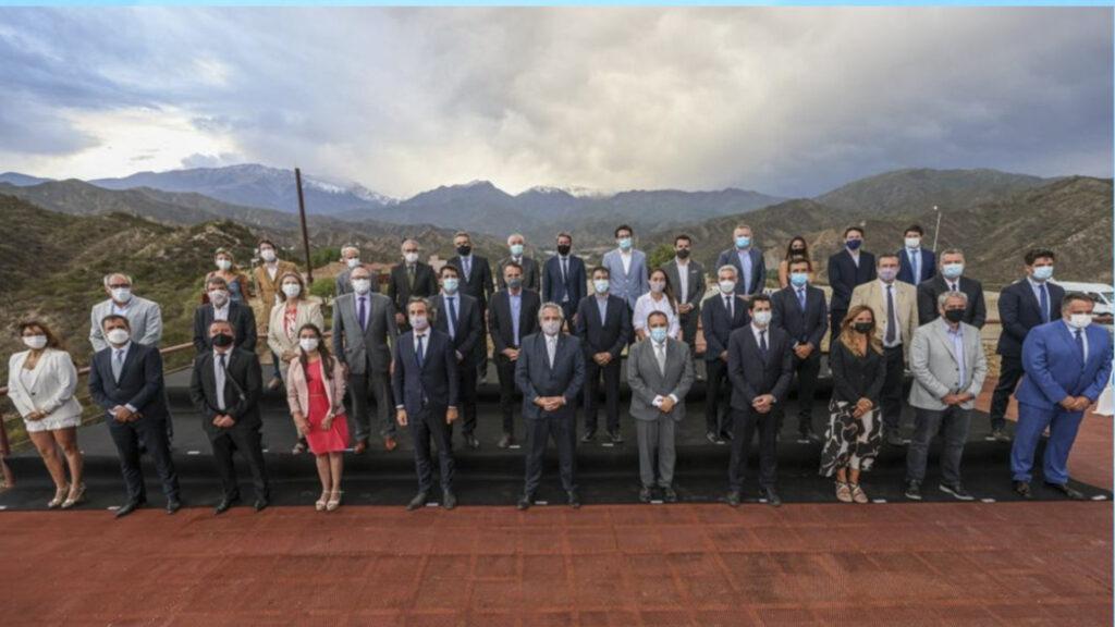 El mandatario nacional estuvo acompañado por el jefe de Gabinete, Santiago Cafiero y los ministros de Interior, Wado de Pedro; de Obras Públicas, Gabriel Katopodis; de Agricultura, Luis Basterra; de Turismo y Deporte, Matías Lammens; de Ambiente y Desarrollo Sostenible, Juan Cabandié; de Desarrollo Territorial y Hábitat, Jorge Ferraresi; de Desarrollo Productivo, Matías Kulfas; de Transporte, Mario Meoni; de Ciencia, Técnica e Innovación, Roberto Salvarezza, y de Cultura, Tristán Bauer.