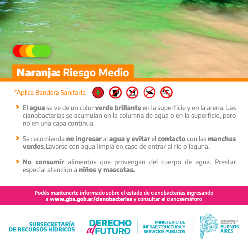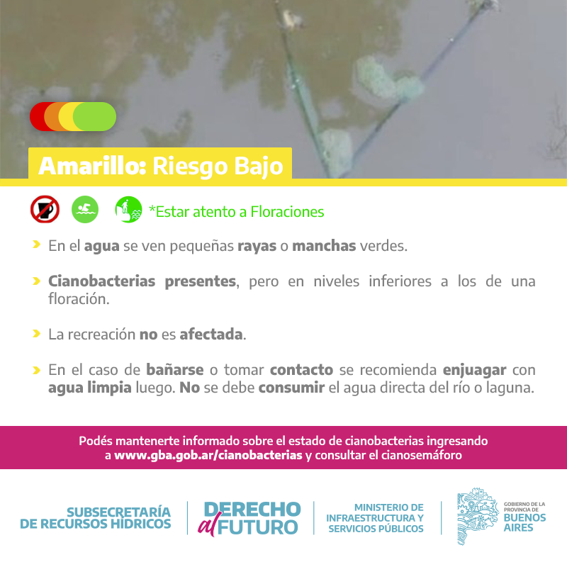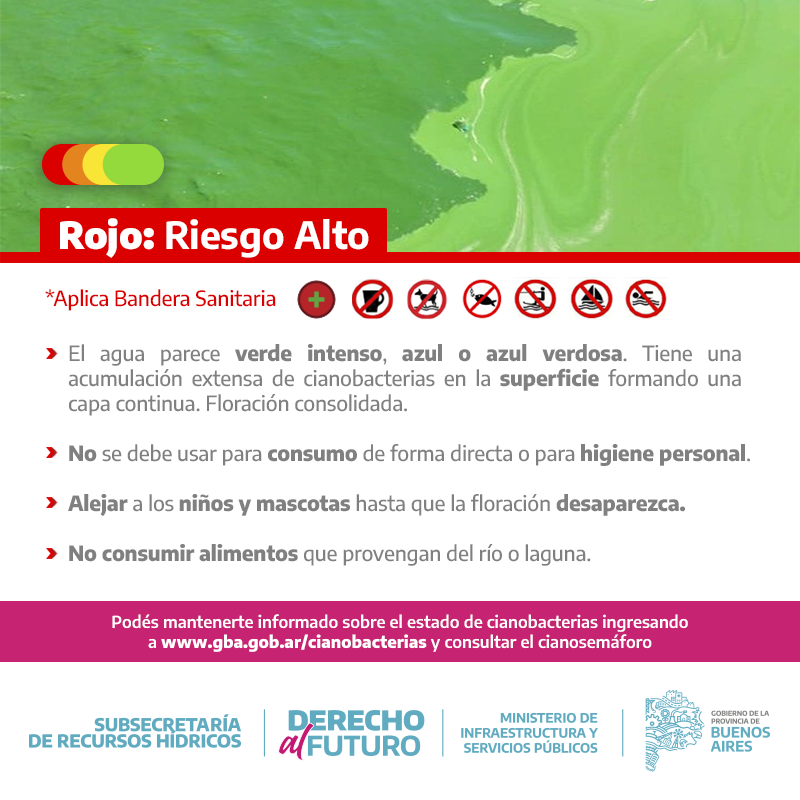 El cianosemáforo se puede consultar en gba.gob.ar/cianobacterias dónde también se encuentra disponible material descargable para difusión sobre qué son y cómo actuar ante su contacto.