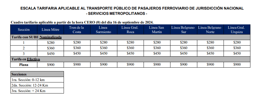 Mediante la Resolución 29/2024 firmada por Franco Mogetta, Secretario de Transporte, el Ministerio de Economía, autorizó que el boleto de trenes en el Área Metropolitana de Buenos Aires (AMBA) aumentará un 40% promedio y la tarifa mínima pasará a $280 por viaje.