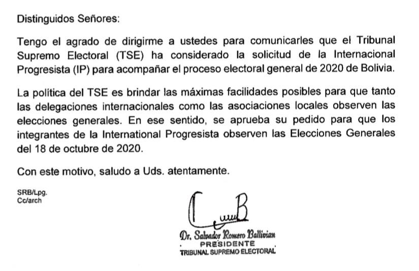 El Tribunal Supremo Electoral de Bolivia (TSE) informó que aceptó la solicitud para que «los integrantes de la Internacional Progesista observen las elecciones generales del 18 de octubre de 2020«.