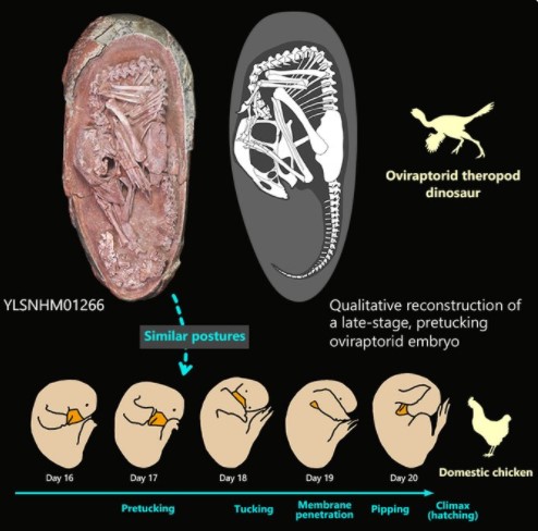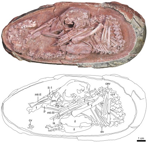 En una publicación en la revista iScience se explica que «El esqueleto embrionario articulado se conserva enrollado dentro de su huevo, con el cráneo colocado ventral al cuerpo».
