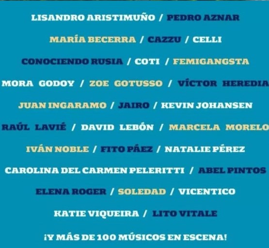 Fito Páez, Abel Pintos, Lisandro Aristimuño, Jairo, Coti, Carolina Peleritti, Elena Roger y Mora Godoy, Pedro Aznar y Raúl Lavie son algunos de los artistas que tomarán parte del concierto .