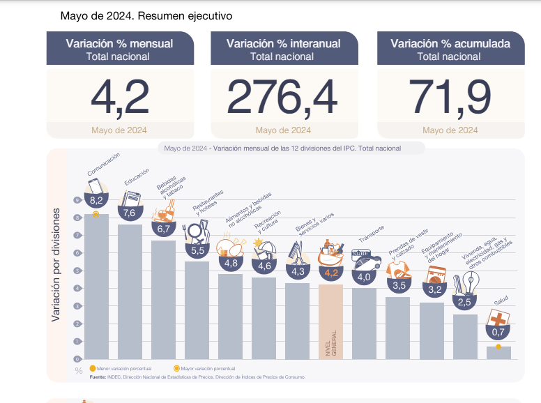 El Instituto Nacional de Estadísticas y Censo (INDEC) informó que el Nivel general del Índice de precios al consumidor (IPC) representativo del total de hogares del país registró en mayo una variación de 4,2% con relación al mes anterior.