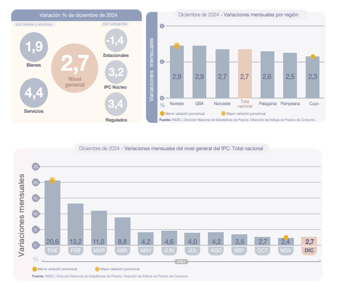 El Indec registró una suba de la inflación en el último mes del 2024, el organismo informó que «el nivel general del Índice de precios al consumidor registró un alza mensual de 2,7% en diciembre de 2024, y acumuló en el año una variación de 117,8%».