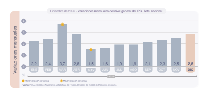 El nivel general del Índice de Precios al Consumidor (IPC) registró la quinta suba consecutiva y fue de 2,8% en diciembre de 2025. Con este dato, la inflación acumulada a lo largo de todo el año alcanzó el 31,5%.
