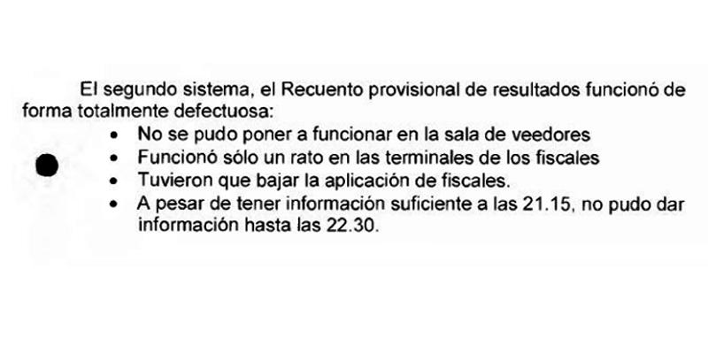 Sobre el Sistema de Recuento Provisional de Resultados (RPR) dijeron que “funcionó de forma totalmente defectuosa” y detallaron una lista con los problemas.