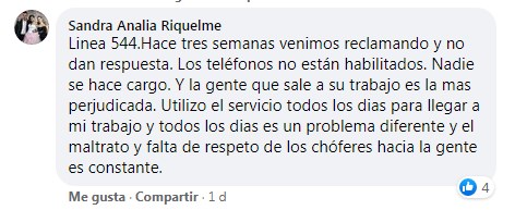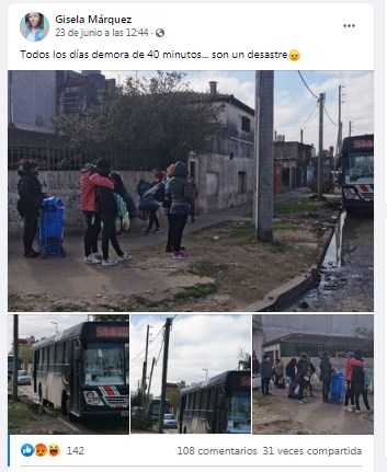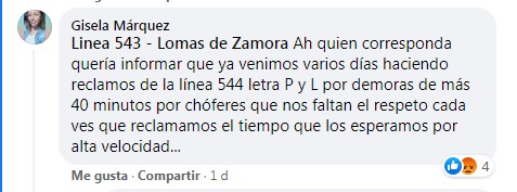 Ante la falta de respuestas Gisela Márquez publicó su reclamo en Facebook: » A quien corresponda quería informar que ya venimos varios días haciendo reclamos de la línea 544 letra P y L por demoras de más 40 minutos por chóferes que nos faltan el respeto cada ves que reclamamos».