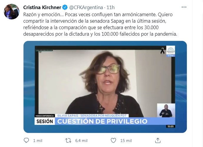 «Razón y emoción… Pocas veces confluyen tan armónicamente. Quiero compartir la intervención de la senadora (Silvia) Sapag en la última sesión, refiriéndose a la comparación que se efectuara entre los 30.000 desaparecidos por la dictadura y los 100.000 fallecidos por la pandemia», escribió la presidenta del Senado de la Nación.