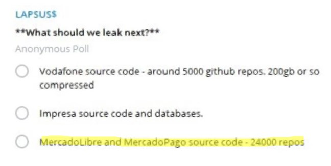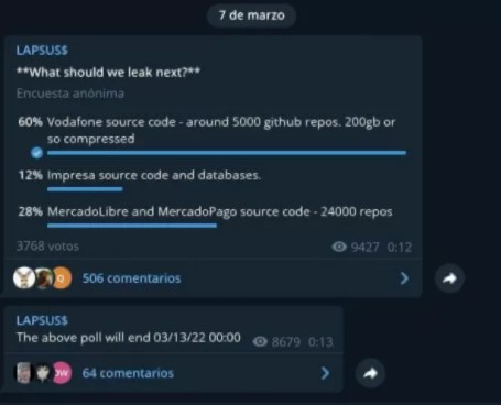 Según señalan los especialistas, el domingo, Lapsus realizó una encuesta entre los integrantes de su comunidad para que votaran la próximo objetivo a hackear. En la lista figuraban las empresas: Vodafone, Impresa, Mercado Libre y Mercado Pago.