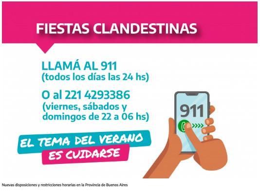 Las denuncias de fiestas clandestinas se reciben a través del 911 y de la línea (221) 429-3386, dispuesta por el Ministerio de Seguridad, la cual funciona viernes, sábados y domingos de 22.00 a 06.00 horas exclusivamente para este tipo de delitos.