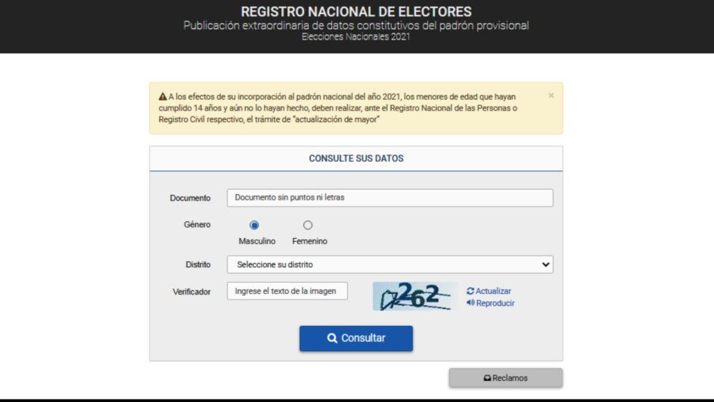 La consulta en el padrón electoral provisorio 2021 de la Argentina es gratuito. No se realiza por nombre y apellido, solo por número de documento.