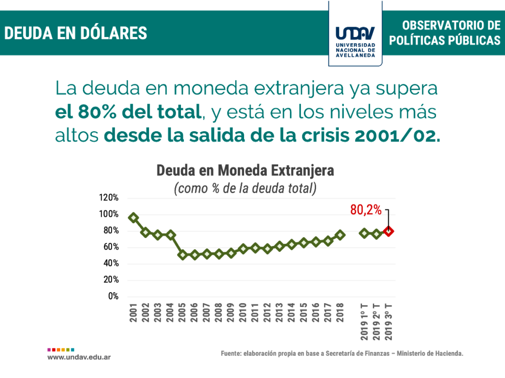 El informe elaborado por el equipo de economistas de Economía en UNDAV, advierte que la deuda en moneda extranjera alcanzó el 80,2% del total, en el tercer trimestre de este 2019.