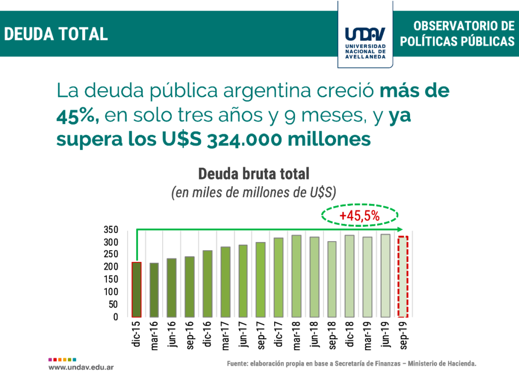 En base a datos de la Secretaría de Finanzas, el informe de la UNDAV indica que la deuda pública creció un 45,5% en tres años y nueve meses, y ya supera los 324 mil millones de dólares.