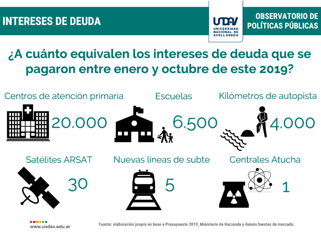 Lo pagado de intereses de deuda entre enero y octubre de este año, equivale a 20.000 centros de atención primaria; 6.500 escuelas; 4.000 km de autopistas; 30 satélites ARSAT; 5 líneas de subte; o 1 central Atucha.