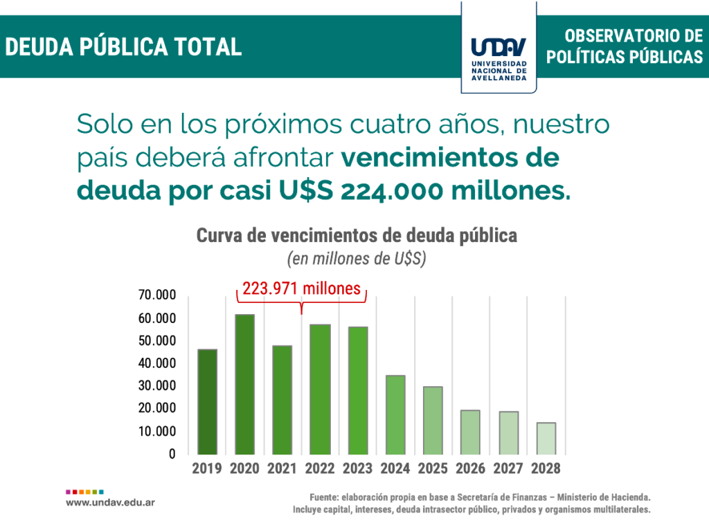 Por último, el documento de la UNDAV resalta que el próximo gobierno deberá afrontar vencimientos de deuda por casi 224 mil millones de dólares, a lo largo de todo su mandato.