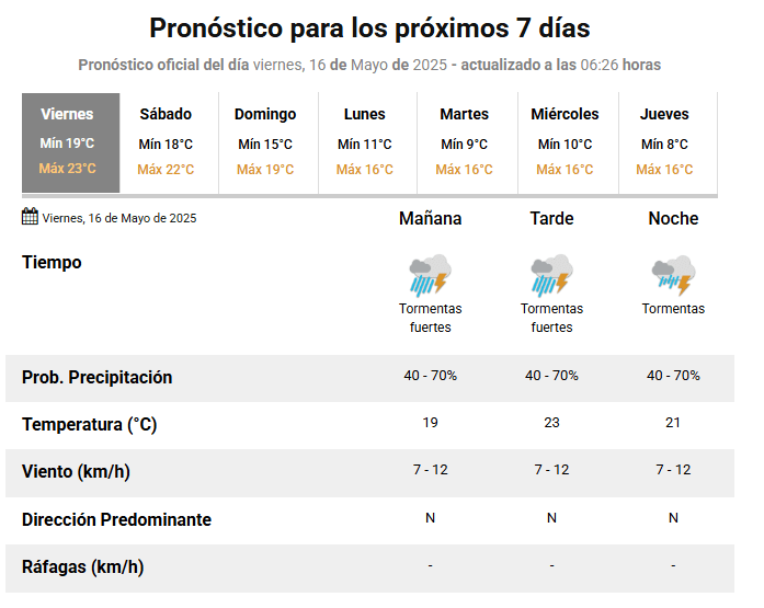 - El pronóstico indica que se registrarán tormentas de principio a fin, siendo más débiles hacia el cierre de la jornada. La temperatura máxima será de 24 grados este viernes.