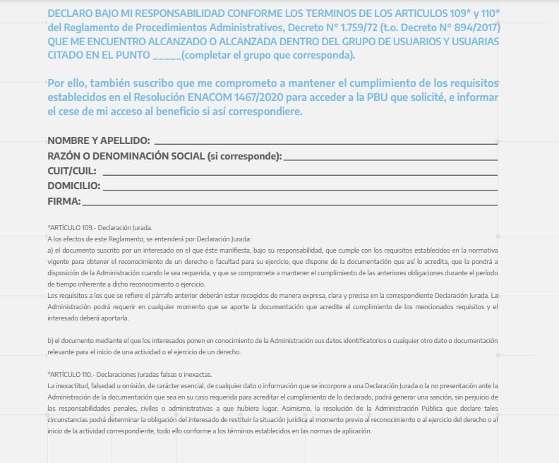 De todos modos el ENACOM puso a disposición una “Declaración Jurada Tipo” que podrá ser completada por el beneficiario y enviada a su prestador, quien deberá aceptarla como medio de acreditación.