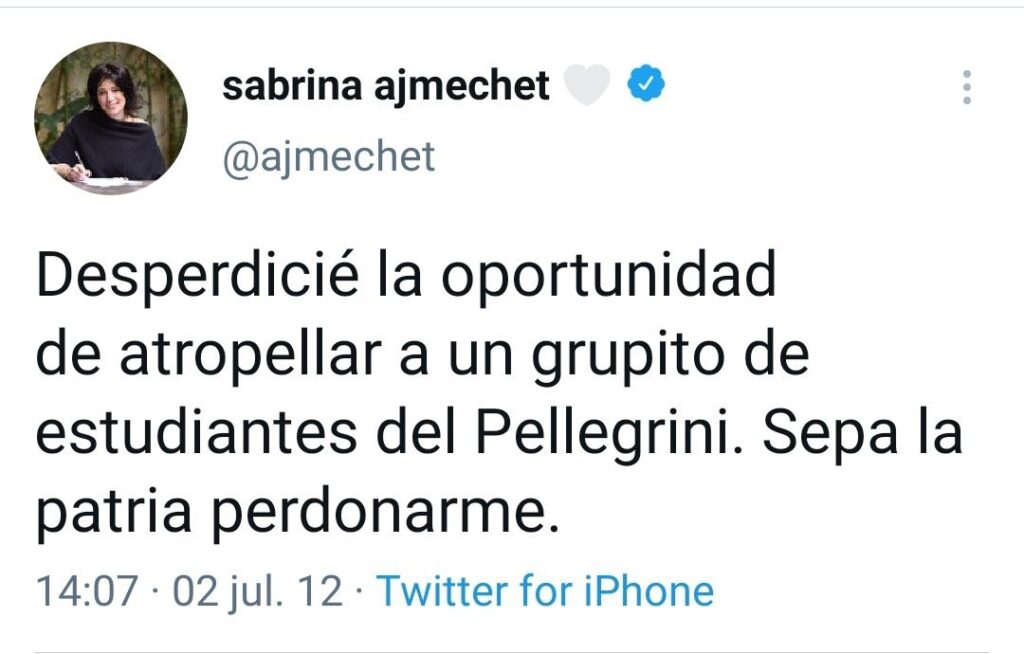 Sabrina Ajmechet, precandidata a diputada por la extrema derecha macrista: “Desperdicie la oportunidad de atropellar a un grupito de estudiantes del Pellegrini. Sepa la patria perdonarme.”. Con una justicia democrática, esta personaje siniestra estaría procesada. pic.twitter.com/iom5t9Qjh0