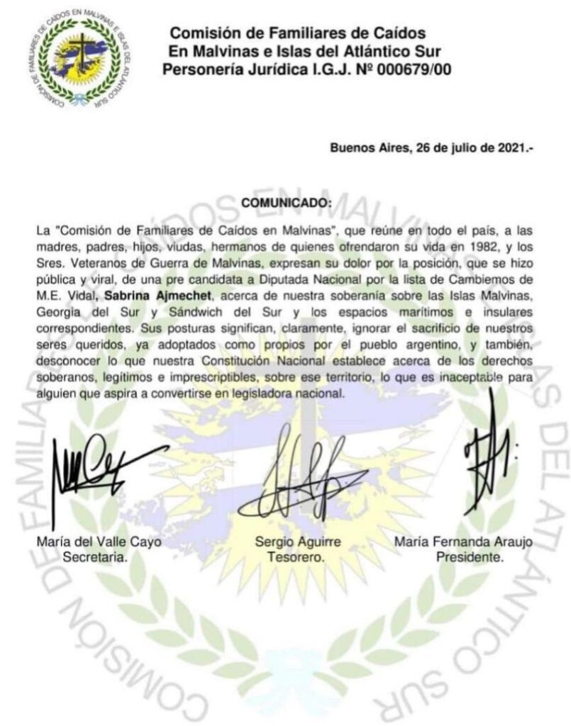 Combatientes en Malvinas rechazan la candidatura de Sabrina Ajmechet.#HalconesEscondidos pic.twitter.com/g8x5RPlV0S