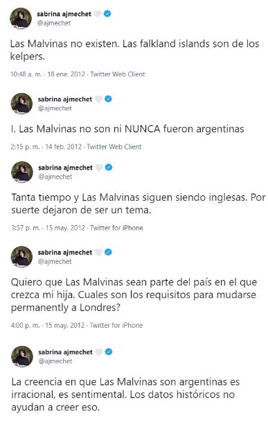 En las redes sociales se difundieron una serie de posteos en Twitter de Sabrina Ajmechet, en los cuales niega la soberanía Argentina sobre las islas Malvinas.