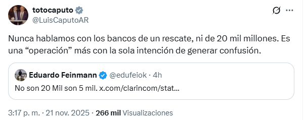 Tras la publicación del artículo, el Ministro de Economía, Luis Caputo, utilizó su cuenta en la red social X para desmentir categóricamente la información. El titular del Palacio de Hacienda sostuvo que la versión periodística era una «operación» para generar confusión.