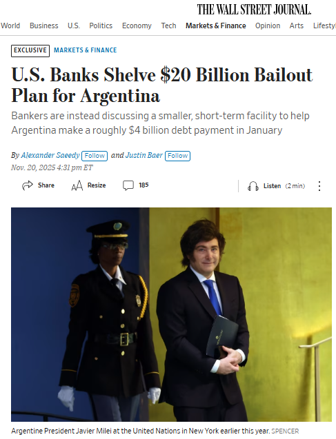 «En su lugar, los banqueros están considerando una línea de crédito más pequeña y a corto plazo para ayudar a Argentina a realizar un pago de deuda de aproximadamente 4.000 millones de dólares en enero» de 2026, afirma el medio norteamericano.