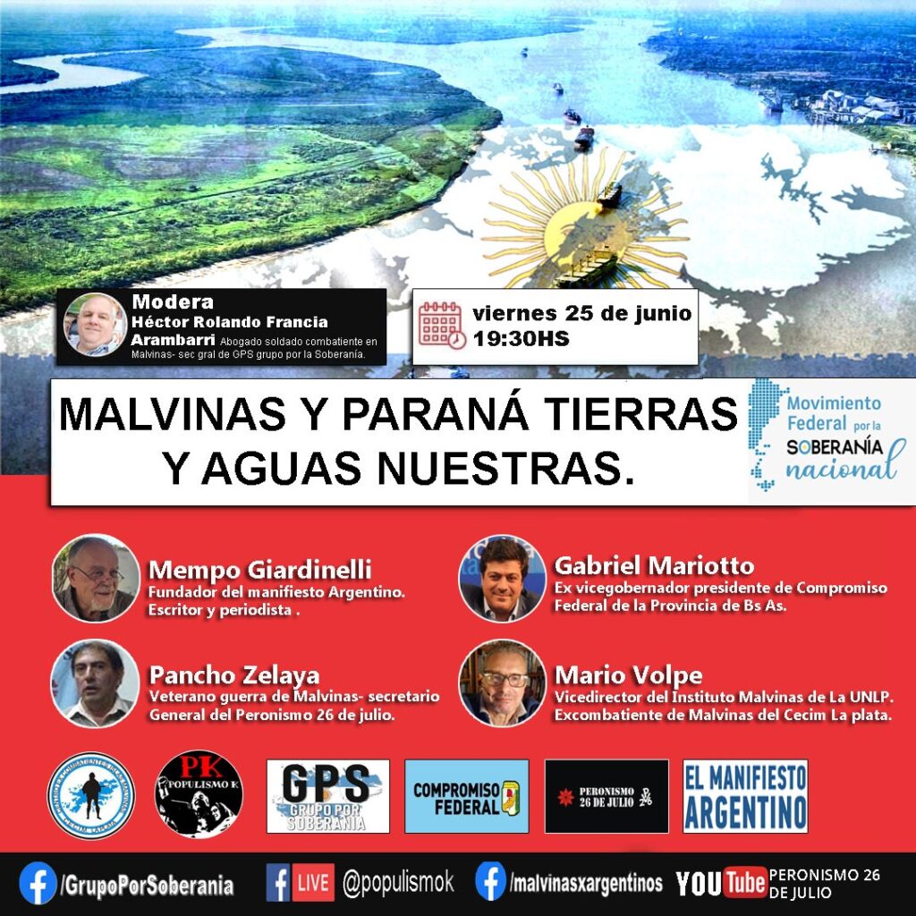 Este viernes 25 de junio a las 19:30 horas se realizará el conversatorio titulado «Malvinas y Paraná tierras y aguas nuestras» organizado por el «Movimiento Federal por la Soberanía Nacional».
