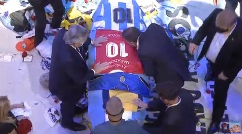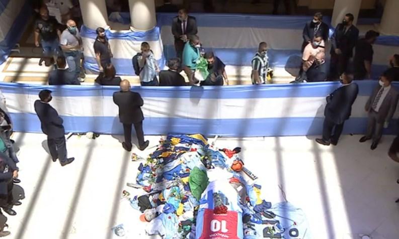 El velatorio del astro del fútbol argentino se realiza a cajón cerrado y está cubierto por la bandera Argentina y camisetas de distintos clubes.