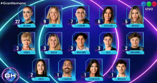 Los nominados de Gran Hermano que sumaron más votos y fueron a placa son: